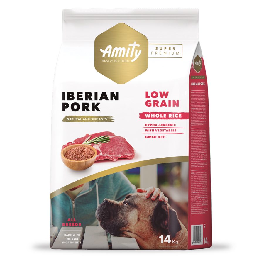 Amity Low Grain Iberian Pork Adult es un alimento para perros adultos de todas las razas y tamaños formulado con cerdo ibérico, arroz integral y verduras. Alimento hipoalergénico y Libre de GMO.